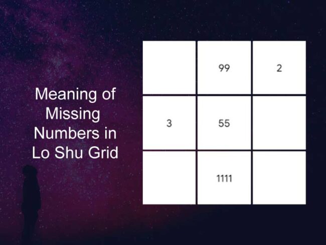 Meaning of Missing Numbers in Lo Shu Grid No 1 if missing in loshu then difficulty to express their inner views, always need support of others, egoless, May stammer at early age. No 2 lack of sensitivity and intuition , may not care other feelings, do not admit their mistake and try to justify their…